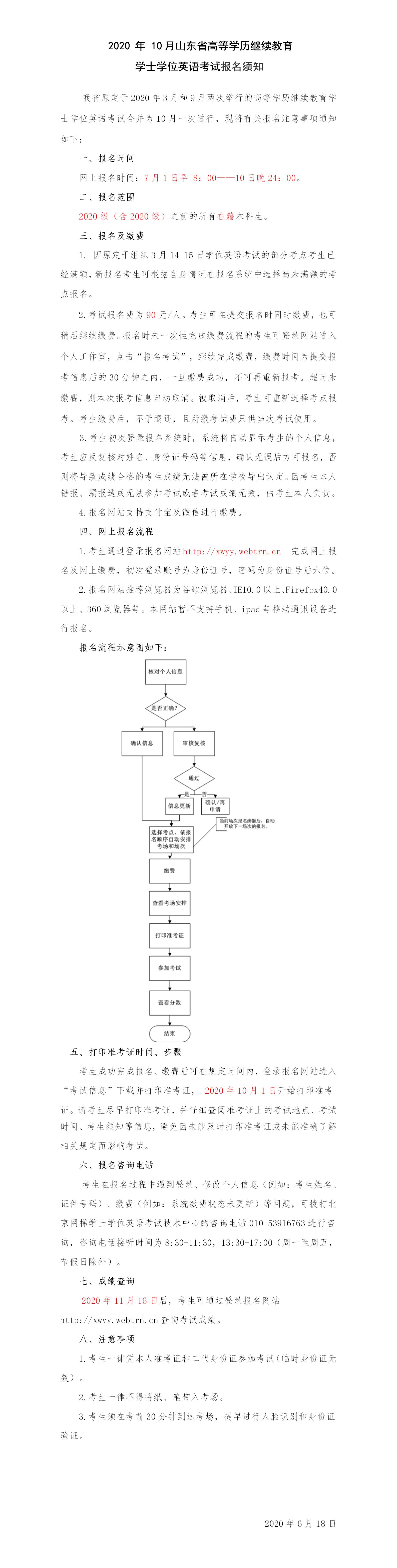 2020 年 10月山东省高等学历继续教育学士学位英语考试报名须知