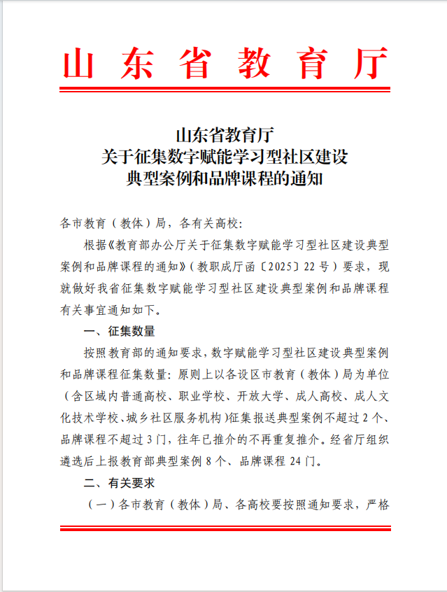 关于转发《山东省教育厅关于征集数字赋能学习型社区建设典型案例和品牌课程的通知》